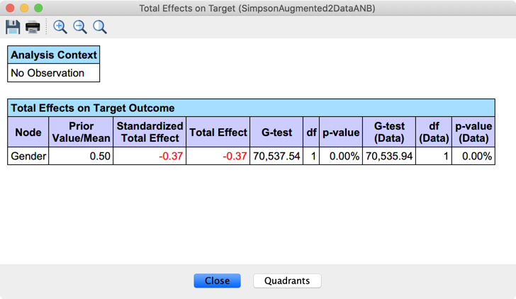 Now that we have seen how to estimate the Average Causal Effect by manually interacting with the BayesiaLab’s Monitors, with both Graph Surgery and Likelihood Matching, we will use the BayesiaLab’s Direct and Total Effect functions to compute causal effects automatically for a set of variables. But first, we present a slightly more complex version of Simpson’s Paradox to illustrate these features (see Example: Simpson’s Paradox).