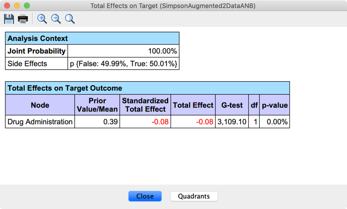 Before using BayesiaLab’s automated tools for computing causal effects, we manually estimated the causal effect of our main variable of interest, Drug Administration, by using the Monitors.