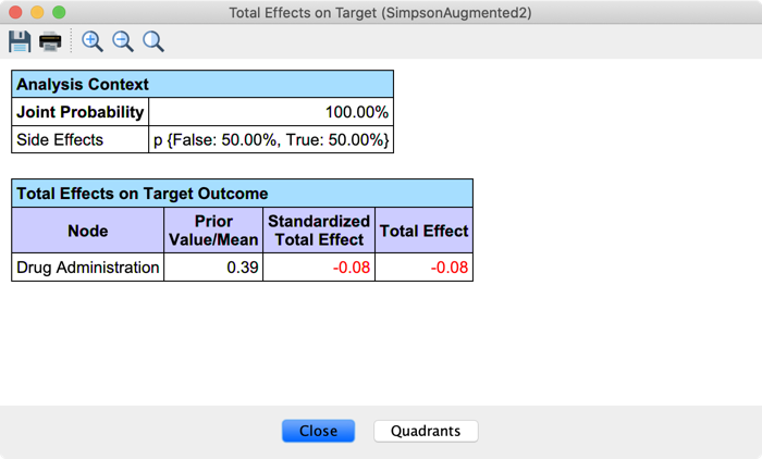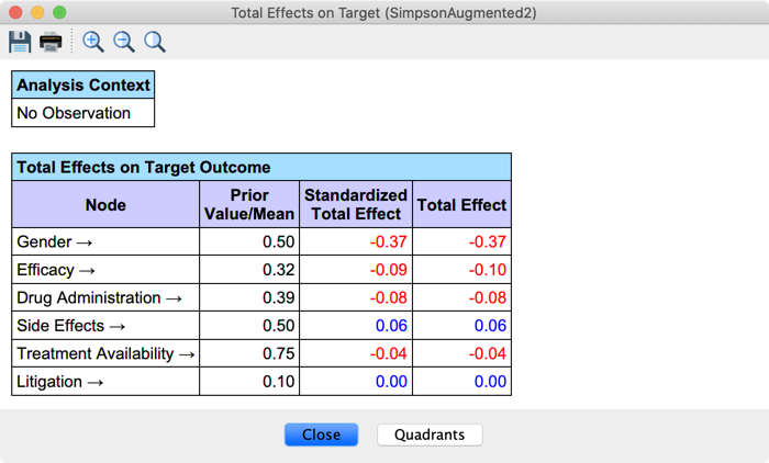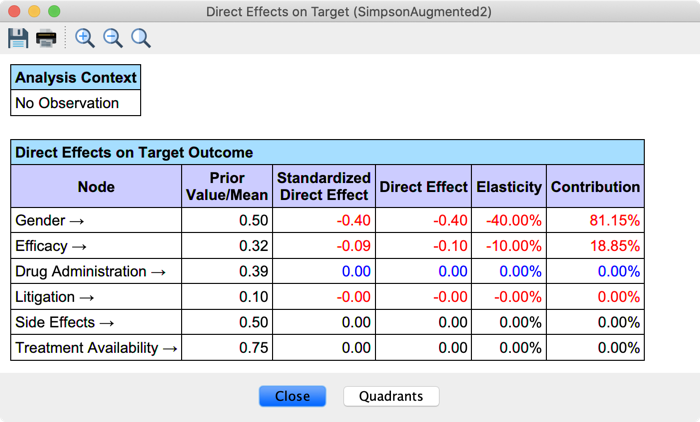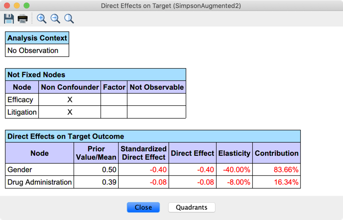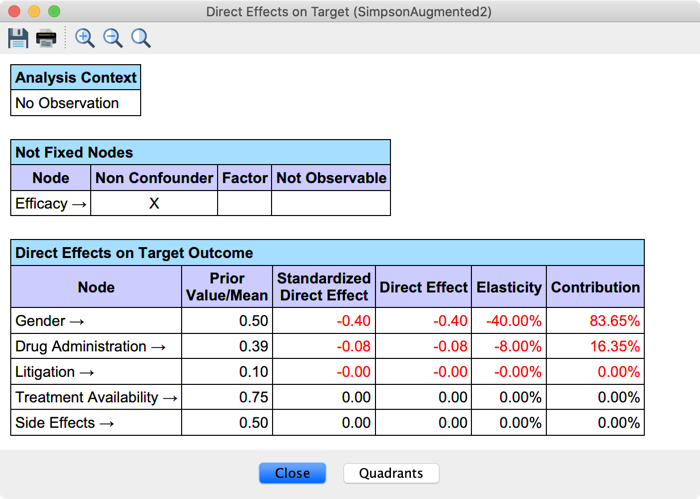 Drug Administration’s Direct Effect now equals the Average Causal Effect we manually computed with the Monitors. You can also note that we no longer analyze the effect of the Non-ConfounderEfficacy.