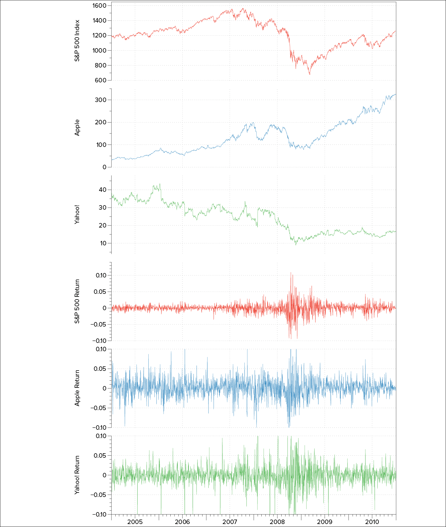 The S&P 500 is a free-float capitalization-weighted index of the prices of 500 large-cap common stocks actively traded in the United States, which has been published since 1957. The stocks included in the S&P 500 are those of large publicly held companies that trade on either of the two largest American stock market exchanges; the New York Stock Exchange and the NASDAQ. For our case study, we have tracked the daily closing prices of all stocks included in the S&P 500 index from January 3, 2005, through December 30, 2010, only excluding those stocks that were not traded continuously over the entire study period. This leaves a total of 459 stock prices with 1,510 observations each. The top three panels show the S&P 500 Index, plus the stock prices for Apple Inc. and Yahoo! Inc. Note that the plot of the S&P 500 Index is only shown for reference; the index will not be included in the analysis.