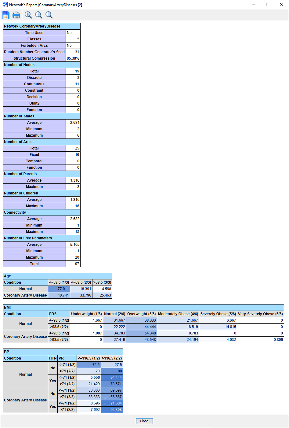 - It includes statistics about the network structure as a whole, plus details for each node, such as the Node States, the Conditional Probability Tables, and equations.
