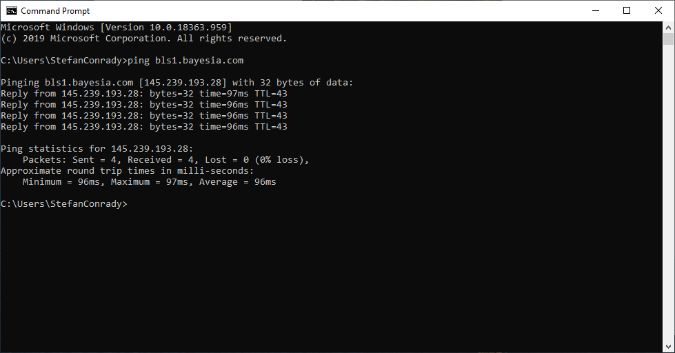 - To check whether you can connect to the Global Bayesia License Server, open Command Prompt (on a Windows PC) or Terminal (on a Mac) and enter ping bls1.bayesia.com.
