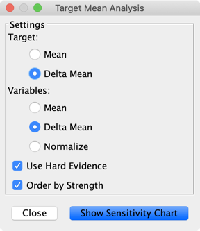 The x-axis, Variable Delta Means, represents the difference between the Mean Value generated for the analysis (here, Hard Evidence/Intervention on the states of the variable under study) and its Prior Mean Value. The y-axis represents the difference between the PosteriorMean Value of Outcome and its PriorMean Value.