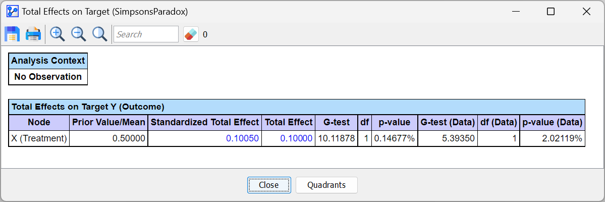 We immediately obtain a report that shows a Direct Effect of −0.1. This value is identical to the Average Treatment Effect we computed in the previous chapter. As expected, adjustment by stratification, Graph Surgery, and Likelihood Matching provides the same effect estimate.