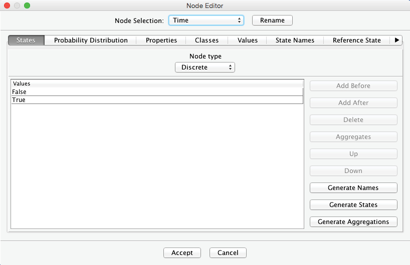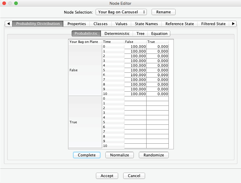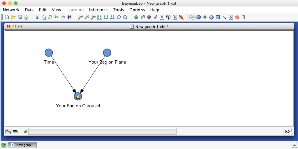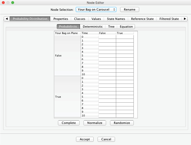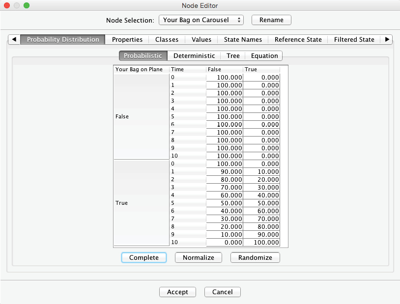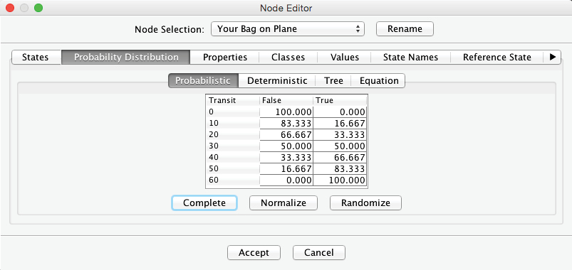 The yellow warning triangles indicate that the Conditional Probability Tables of and have yet to be filled. Thus, we need to open the Node Editor and set these probabilities. We will assume that the probability of your bag making the connection is 0% given a time of 0 minutes and 100% with a time of 60 minutes. Between those values, the probability of a successful transfer increases linearly with time.