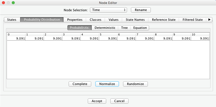 Beyond defining the states of , we also need to define their marginal probability distribution. For this, we select the tab Probability Distribution > Probabilistic. Naturally, no time interval is more probable than another one, so we should apply a uniform distribution across all states of . BayesiaLab provides a convenient shortcut for this purpose. Clicking the Normalize button places a uniform distribution across all cells, i.e., 9.091% per cell.