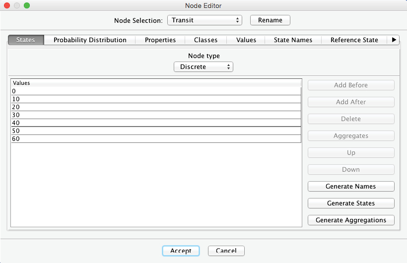 We create seven states of ten-minute intervals for this node, which reflect the amount of time available for the transfer, i.e., from 0 to 60 minutes.