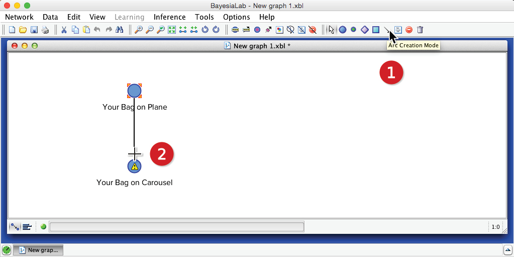 We now encode this knowledge into our network. We add a second node, , and then click the Arc Creation Mode icon . Next, we click and hold the cursor on , drag the cursor to , and finally release. This produces a simple, manually specified Bayesian network: