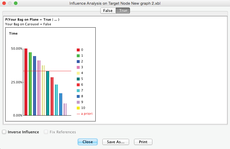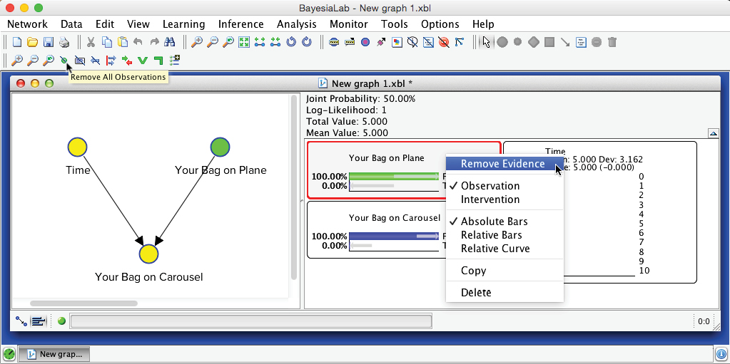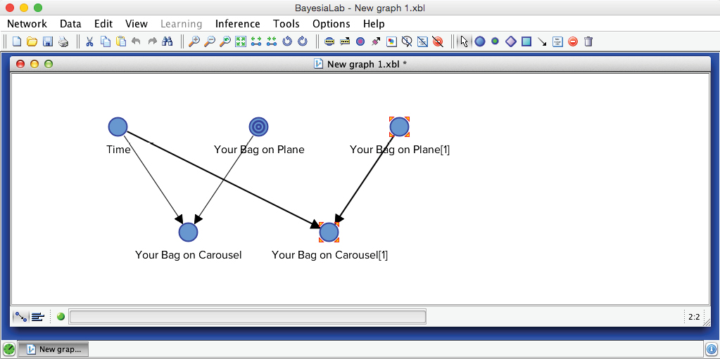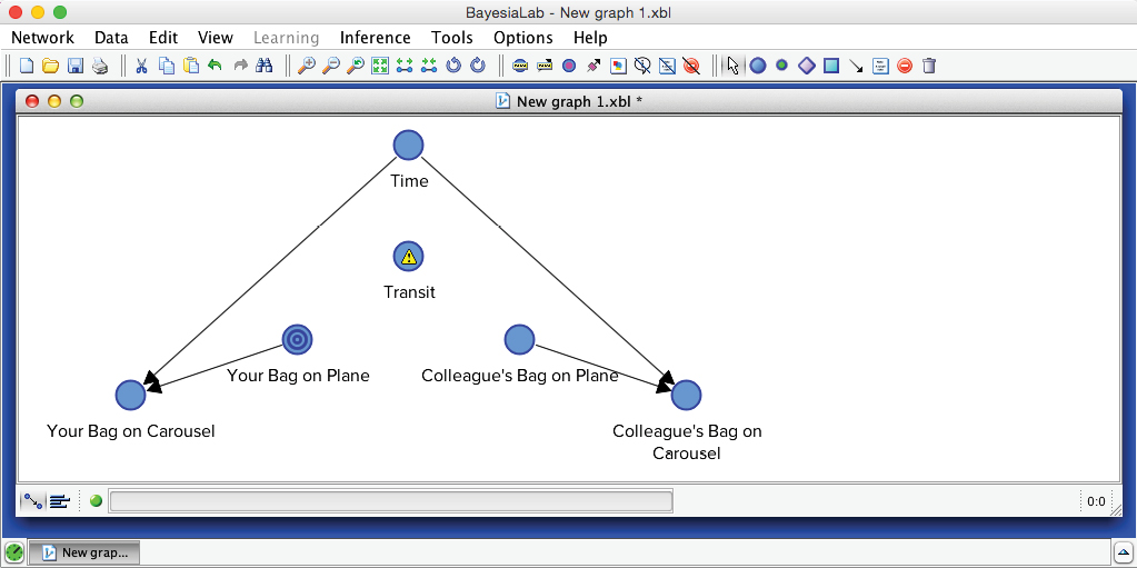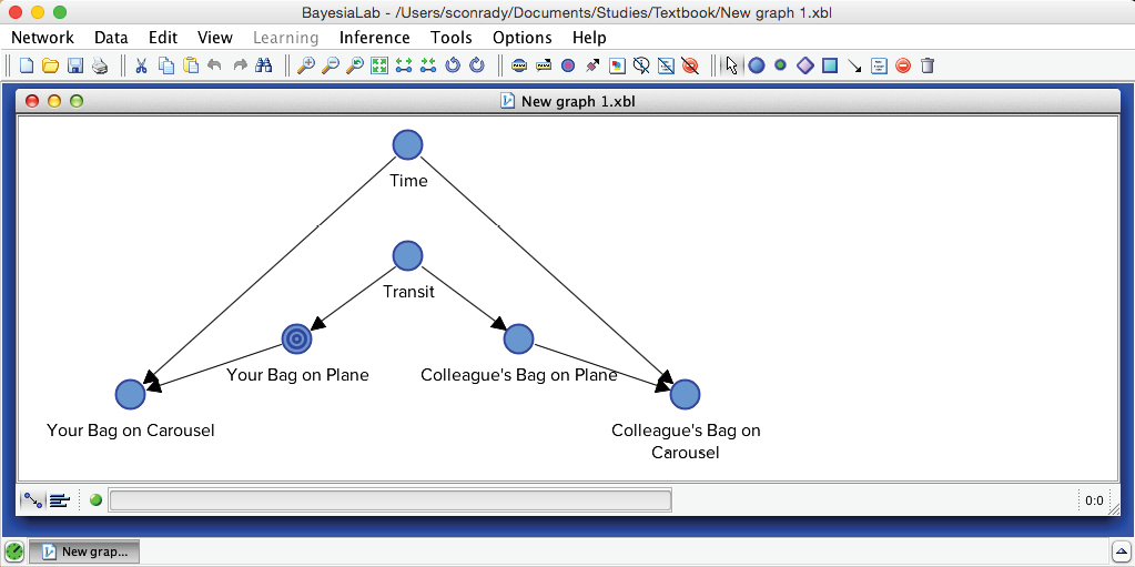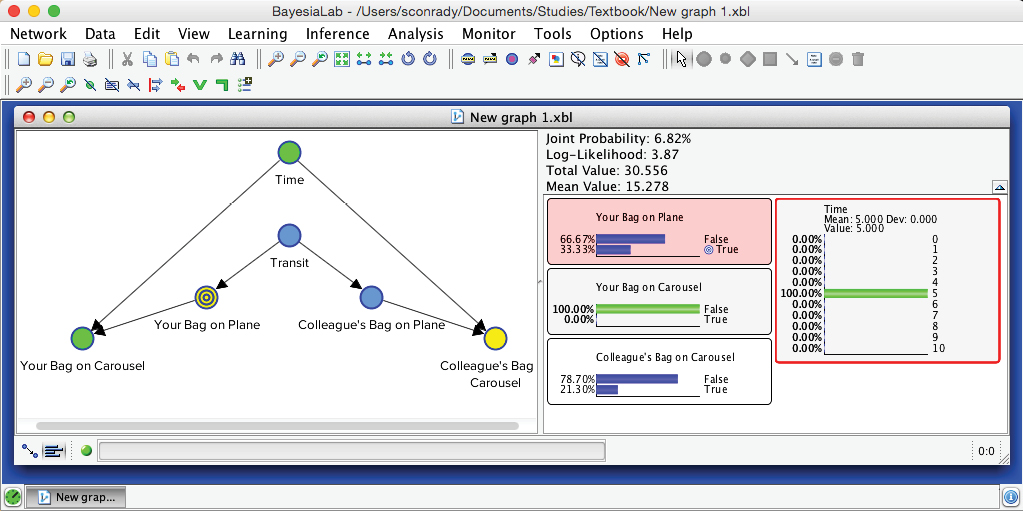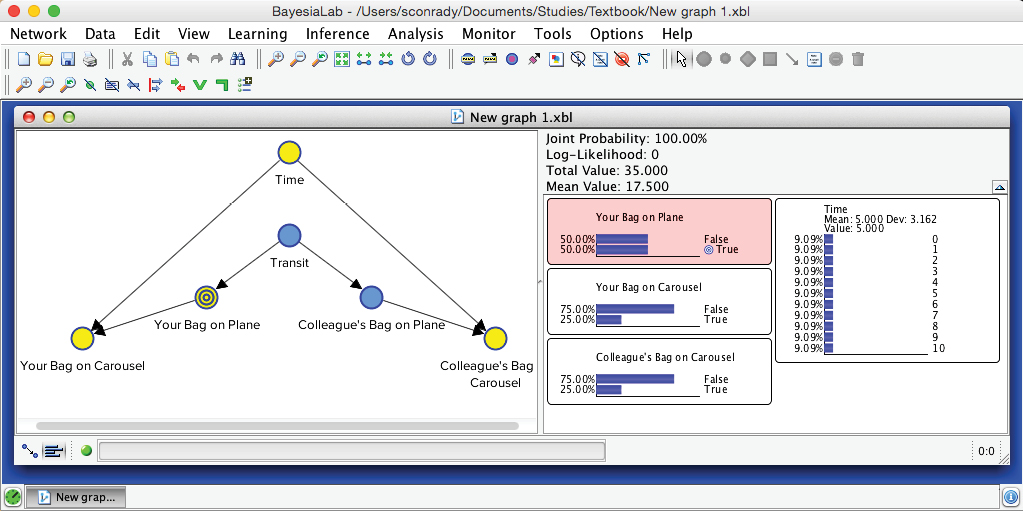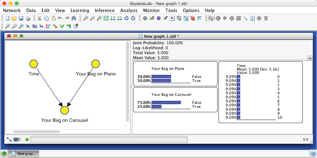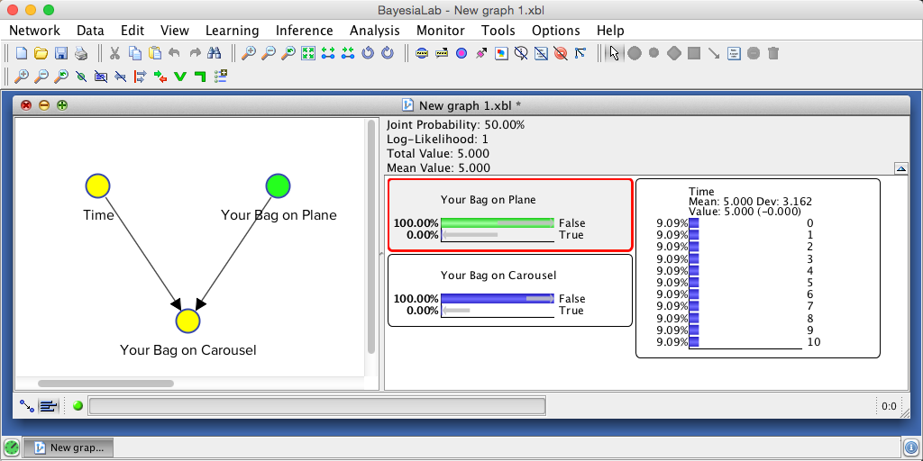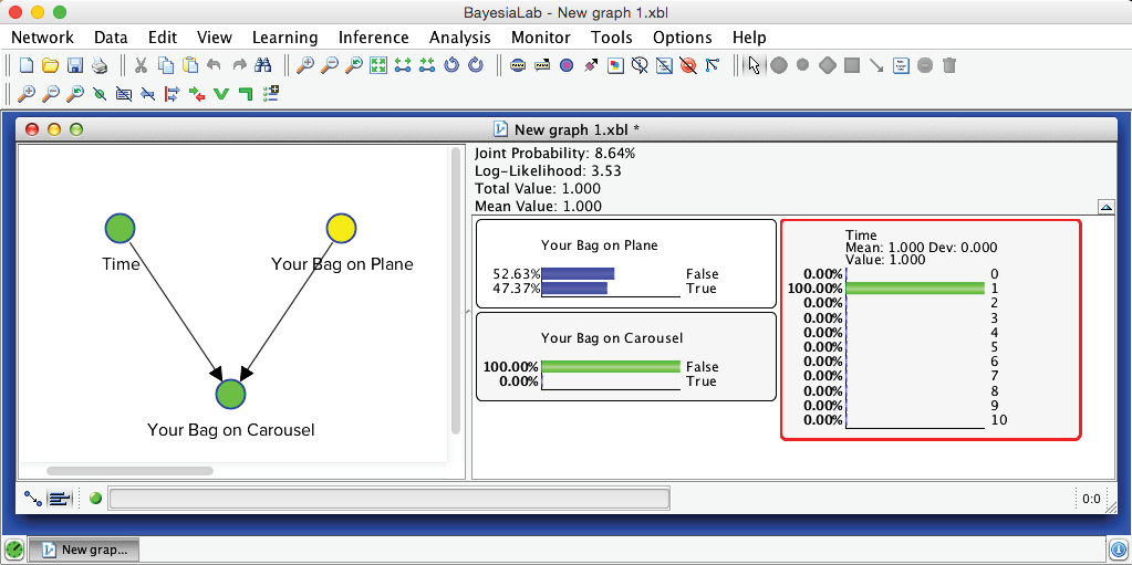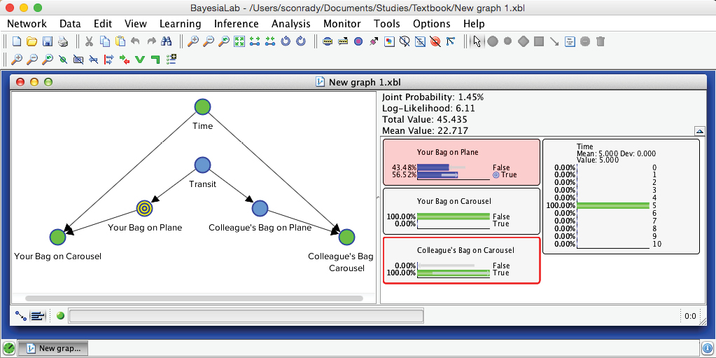 Indeed, your bag could not possibly be on the carousel because it was not on the plane in the first place. The inference we performed here is indeed trivial, but it is reassuring to see that the Bayesian network properly “plays back” the knowledge we entered earlier.