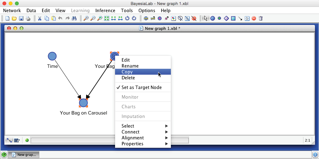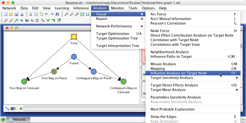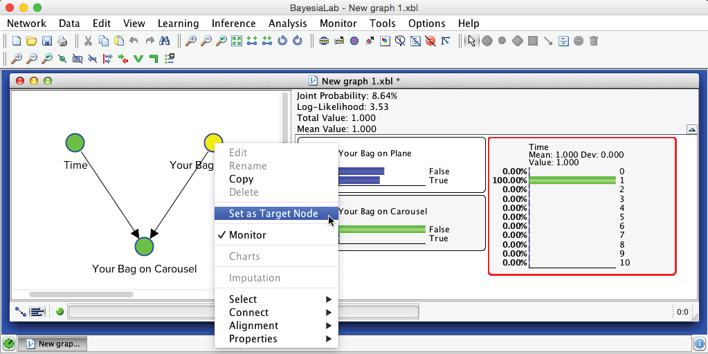 Continuing with this example, how about if the bag has not shown up in the second minute, in the third minute, etc.? We can use one of BayesiaLab’s built-in visualization functions to analyze this automatically. To prepare the network for this type of analysis, we first need to set a Target Node, which, in our case, is . Upon right-clicking this node, we select Set as Target Node. Alternatively, we can double-click the node, or one of its states in the corresponding Monitor, while holding T.