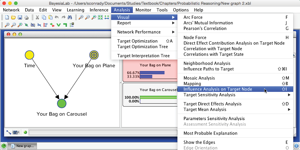 After removing the evidence from the Monitor, we can perform Influence Analysis on Target again in order to see the probability of as a function of , given and . To focus our analysis on alone, we select the node and then select Menu > Analysis > Visual > Influence Analysis on Target.