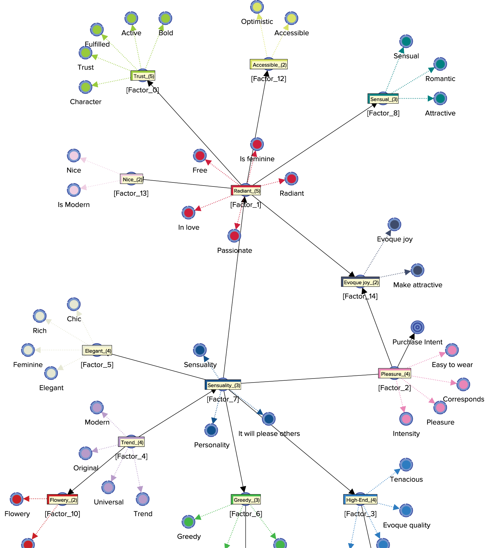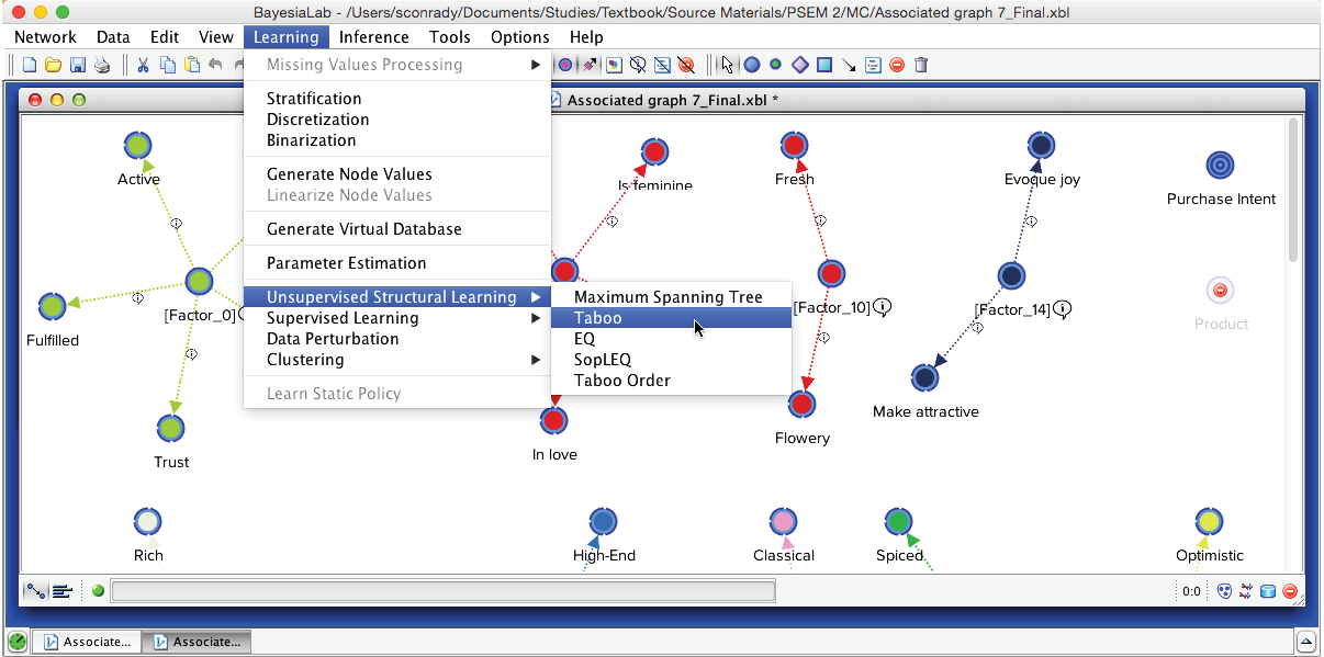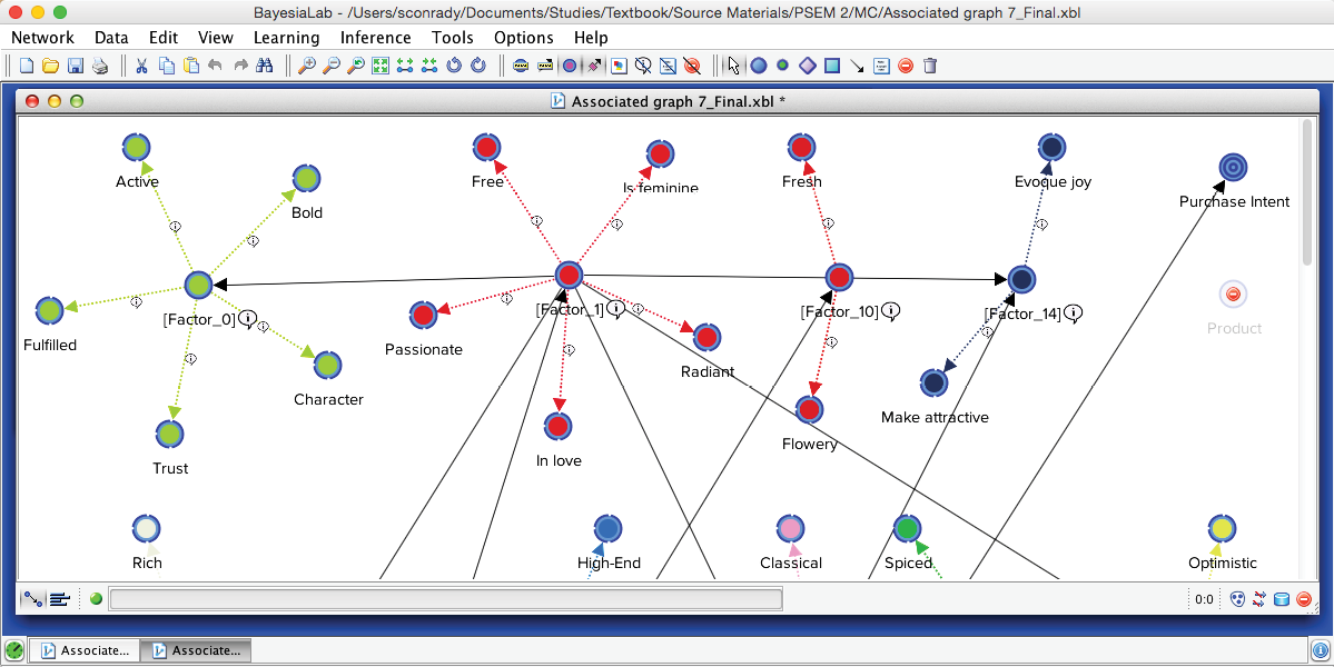 Now we see how the manifest variables are “laddering up” to the Factors and how the Factors are related to each other. Most importantly, we can observe where the Purchase Intent node was attached to the network during the learning process. The structure conveys that Purchase Intent is only connected to [Factor2], which is labeled with the Node Comment “Pleasure(4).”