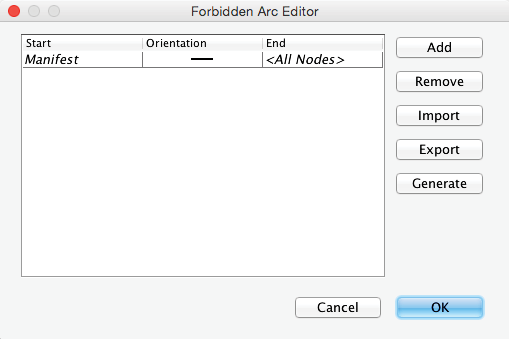 Looking for an SEM-type network structure stipulates that Manifest variables be connected exclusively to the Factors and that all the connections with Purchase Intent must go through the factors. We have already imposed this constraint by setting the option Forbid New Relations with Manifest Variables in the Multiple Clustering dialog box. This created so-called Forbidden Arcs, which prevent learning algorithms from creating new arcs between the specified nodes. BayesiaLab indicates the presence of Forbidden Arcs with an icon in the lower right-hand corner of the Graph Panel window. Clicking on the icon brings up the Forbidden Arc Editor, which allows us to review the currently set constraints. We see that the nodes belonging to the Class Manifest must not have any links to any other nodes, i.e., both directions are “forbidden.”