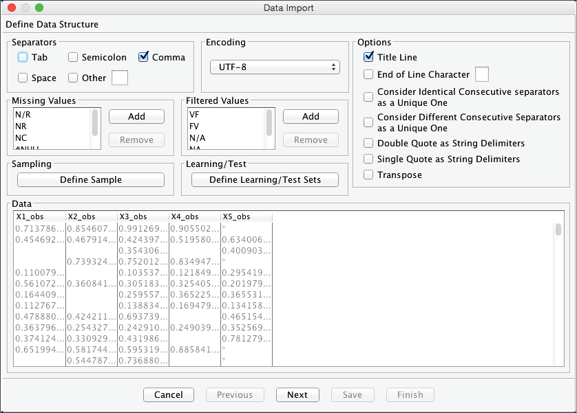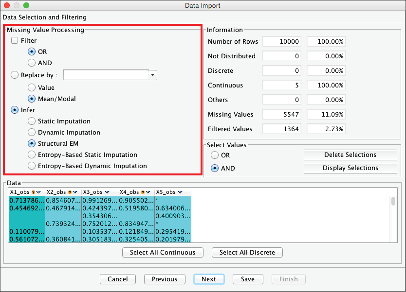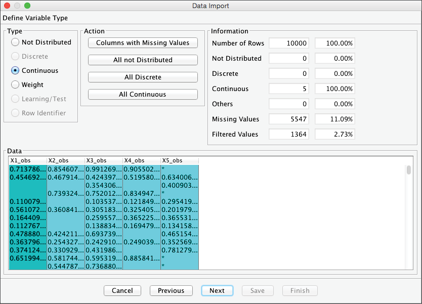 The next step of the Data Import Wizard requires no further input, but we can review the statistics provided in the Information Panel: we have 5,547 missing values (=11.09% of all cells in the Data panel) and 1,364 Filtered Values (=2.73%).