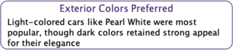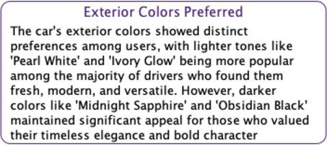 We set out to explore the performance and appeal of a new car model that had been the talk of the town, gathering feedback from drivers with a wide range of experiences. The first thing people noticed was the car’s striking appearance. Available in bold shades like “Midnight Sapphire,” “Crimson Blaze,” and the ever-classic “Pearl White,” the vehicle turned heads at every corner. While darker hues, such as “Midnight Sapphire” and “Obsidian Black,” had their fans, the feedback revealed that lighter tones like “Pearl White” and “Ivory Glow” captured the preferences of a larger portion of users, with many describing them as fresh, modern, and versatile. Nevertheless, the darker colors still held a strong appeal, resonating with a significant group of drivers who appreciated their timeless elegance and bold character.