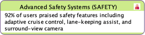 While the domain of the feedback is consistent across both sections, it is important to note that the evaluations pertain to different car models. As such, we do not expect the outputs to align perfectly, offering an opportunity to compare and contrast the drivers of satisfaction for each model.
