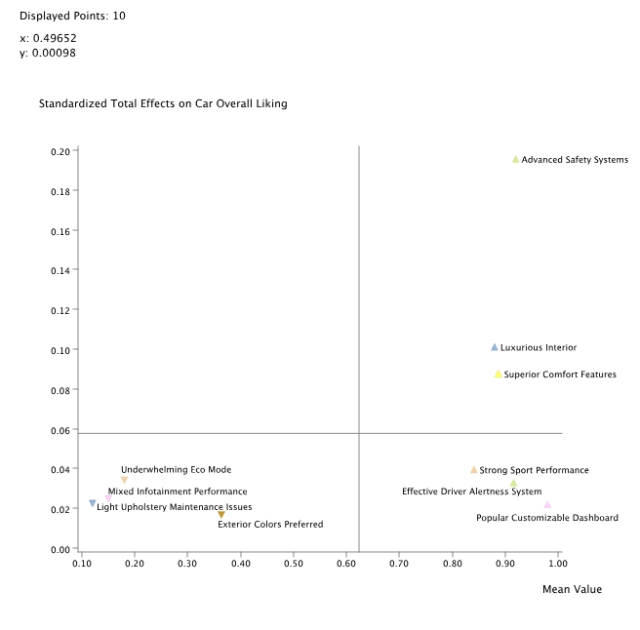 The absence of factors in the third quadrant suggests there are no rare but highly impactful opportunities in this model, simplifying the focus to factors that are either common or have modest effects. This combination of positional and visual cues (triangle orientation) makes it easy to assess both the likelihood and direction of each factor’s influence on Car Overall Liking, enabling strategic prioritization.
