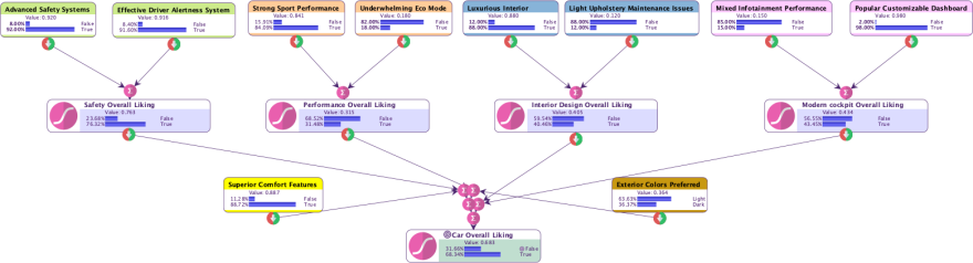 We then apply the Independence of Causal Influence (ICI) approach to model the causal effects of these dimensions on the car’s overall liking.