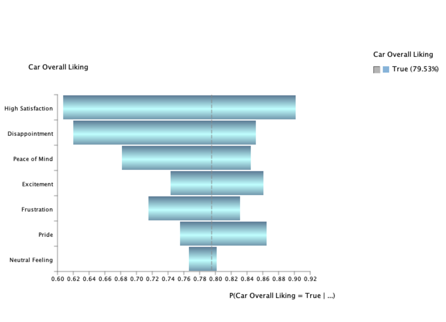 The Tornado graph below illustrates the individual effects of emotions on Car Overall Liking, highlighting (obviously) that High Satisfaction and Disappointment as the most important drivers.