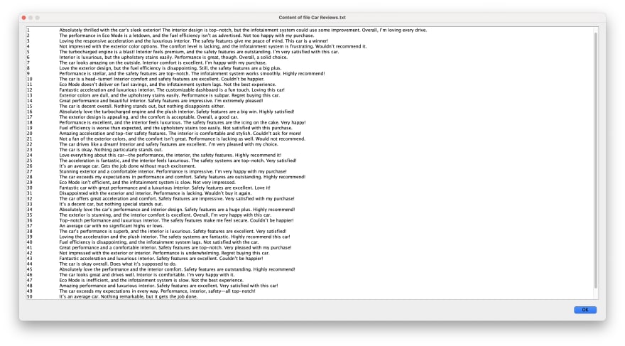 In this section, we analyze 50 individual user feedbacks, each consisting of short textual reviews where users express 2-3 key aspects they liked or disliked about the car (see the preview of the knowledge file Car Reviews.txt that we’ll analyze below).