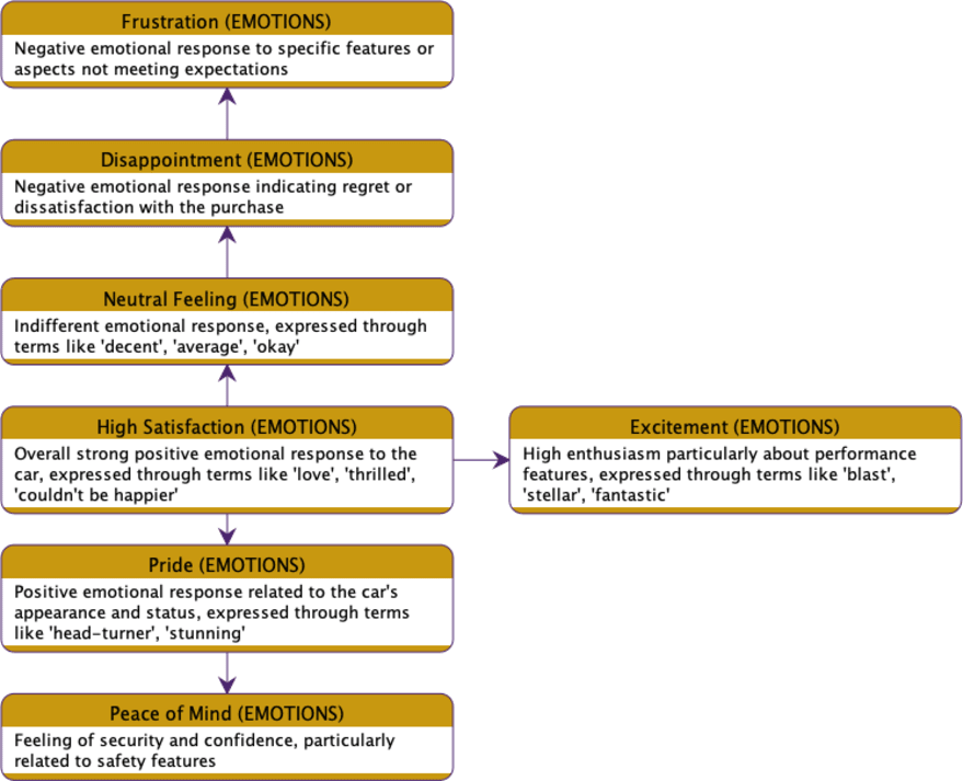 This process generates the semantic graph below that highlights the sentiments users associate with different aspects of the car, such as excitement, satisfaction, frustration, or disappointment.