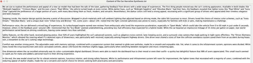 You will find below the content of the file Car Narrative Synthesis.txt that we’ll analyze: