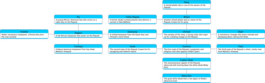 Now, suppose we want to assign a weight reflecting the importance of each character in the book. We can use the query “Herman Melville - Moby Dick (Add a weight in brackets from 0 to 100 to each node’s comments to reflect the importance of that dimension)” to achieve this.