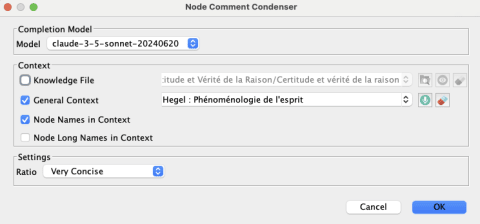 Another method for analyzing a text, particularly when it is large, is to begin by summarizing it. To do this, instead of using a knowledge file, we create a node in a new graph and directly copy the introduction of the Phenomenology of Spirit into the comment of this node.