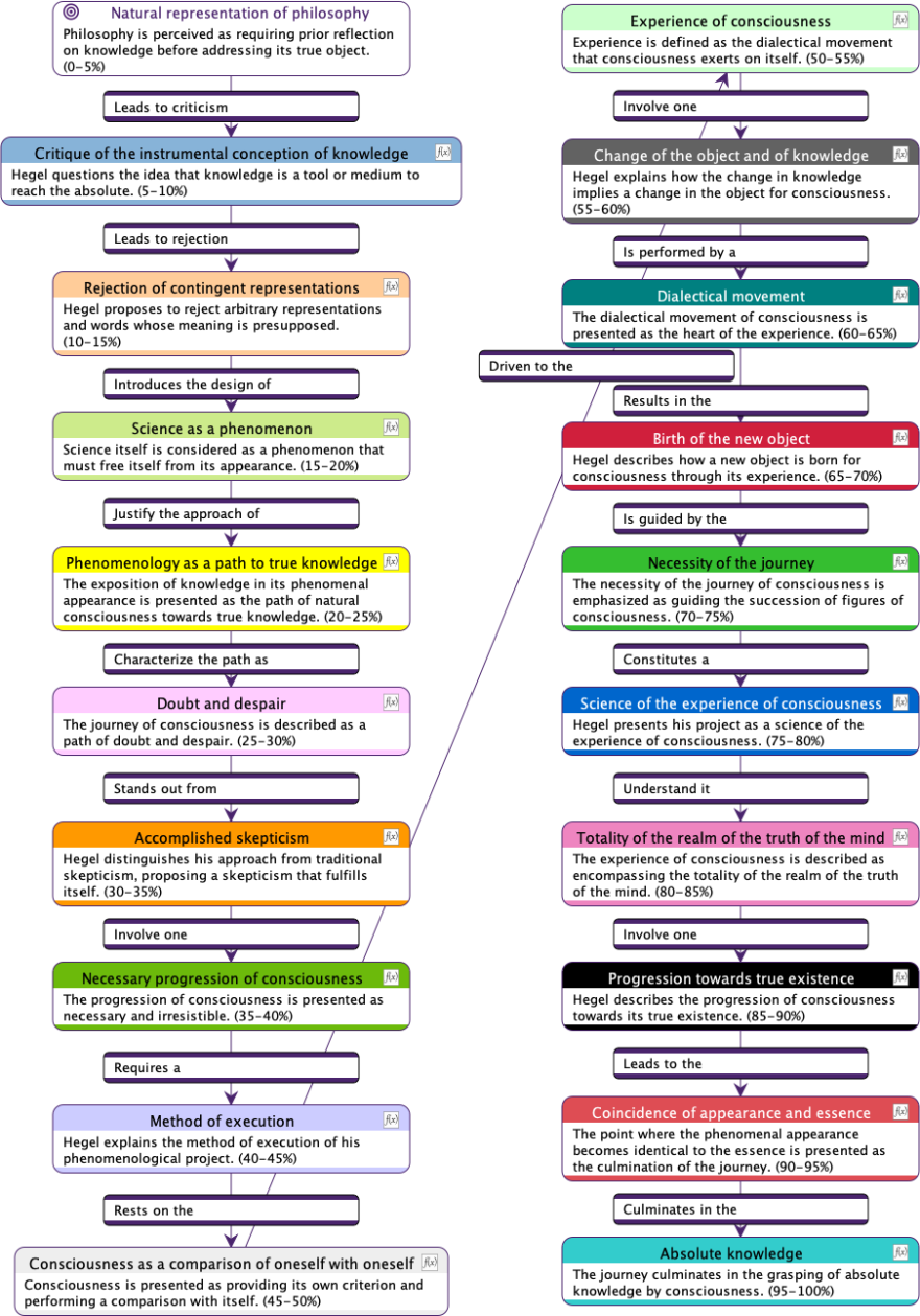 The Semantic Flowchart generated through this process presents a more nuanced and detailed view of the interconnections between Hegelian ideas, offering a visual representation that is both more faithful and accessible to the theoretical complexity of the work.