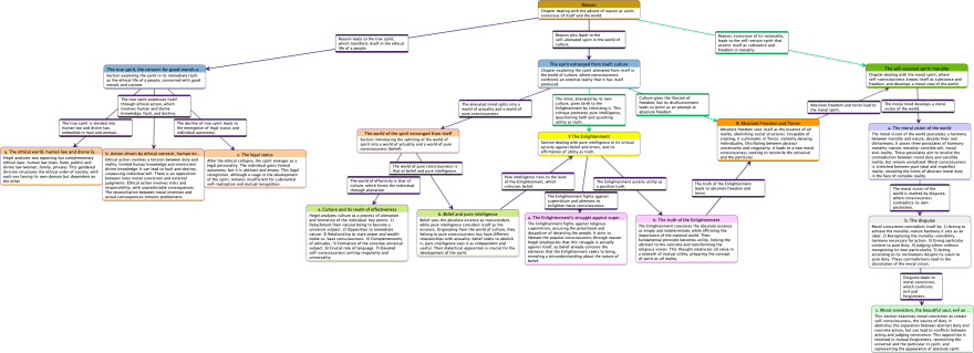 This causal approach provides us with a detailed and dynamic perspective on the work, revealing not only Hegel’s key ideas but also the internal logic that drives and interconnects them. It allows us to grasp the dialectical progression so characteristic of Hegel’s thought, where each thesis generates its own contradictions and leads to new syntheses.