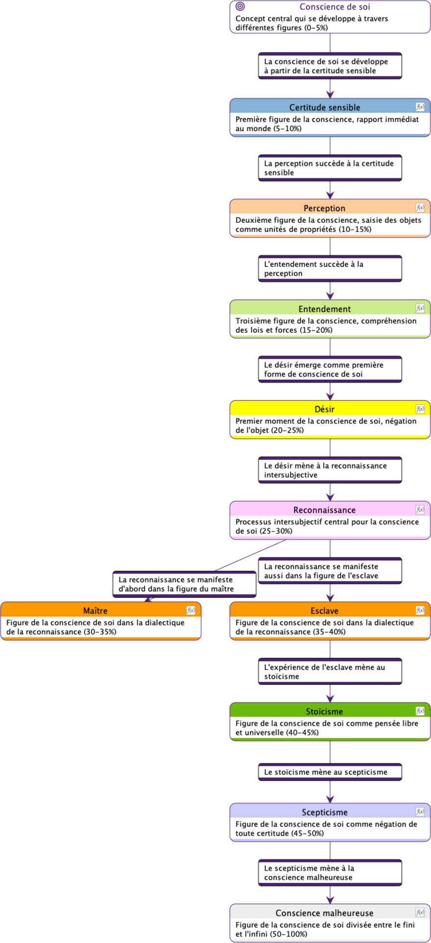 Ce diagramme décrit un processus de développement progressif de la conscience humaine. Chaque étape représente une forme plus sophistiquée de prise de conscience et de compréhension, avec l’aboutissement ultime du savoir absolu, une connaissance totale intégrée du monde et de soi-même. Ce modèle vise à expliciter comment les individus parviennent à une connaissance de plus en plus approfondie de la réalité et de leur propre nature. Hegel conçoit ce cheminement comme une ascension vers l’Esprit absolu, où la conscience atteint sa pleine réalisation.