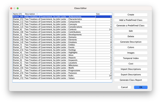 - Open the Class Editor and run Class Description Generator to generate descriptive names for the factors in question. Use the Export Descriptions function and save the newly created descriptions.
