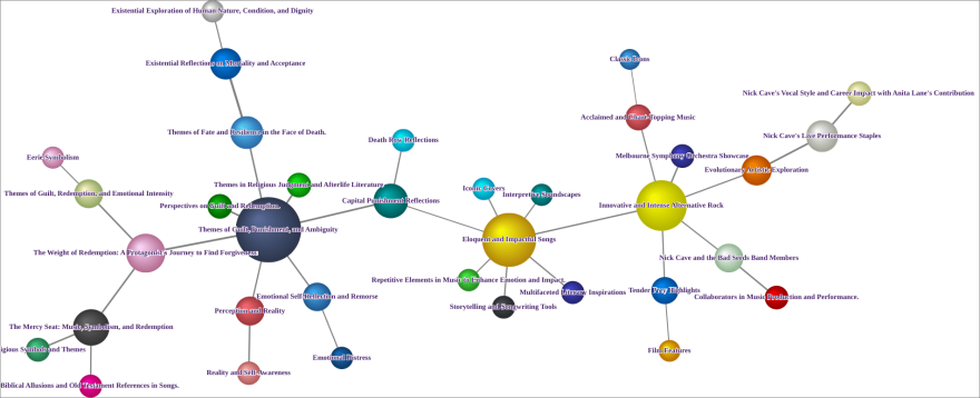 Welcome to our in-depth analysis of “The Mercy Seat ,” an iconic song by Nick Cave. Through this exploration, we will delve into the intricate narratives and powerful emotions embedded within the song. Using Hellixia, we will construct a semantic network that reveals the song’s complex themes and the relationships among them, shedding light on the profound depths of Cave’s storytelling. Join us as we journey into the haunting world of “The Mercy Seat.”