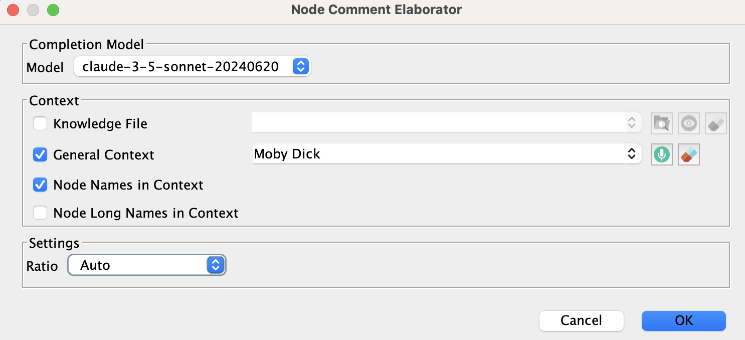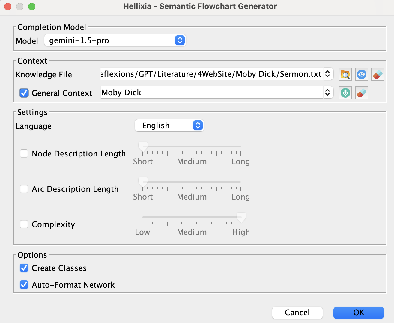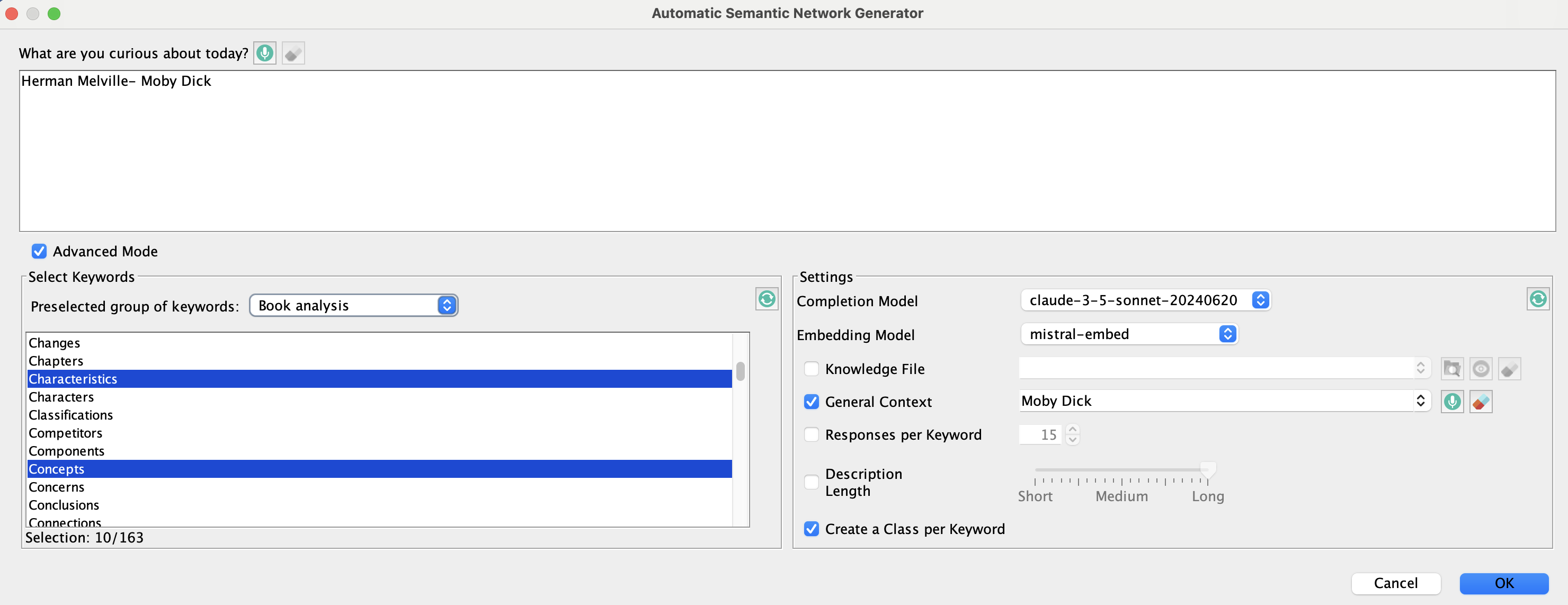 We now proceed with our analysis by utilizing another powerful tool in Hellixia: the Automatic Causal Network Generator. For this step, we use “Herman Melville - Moby Dick Plot” as the input question (see the dialog below).