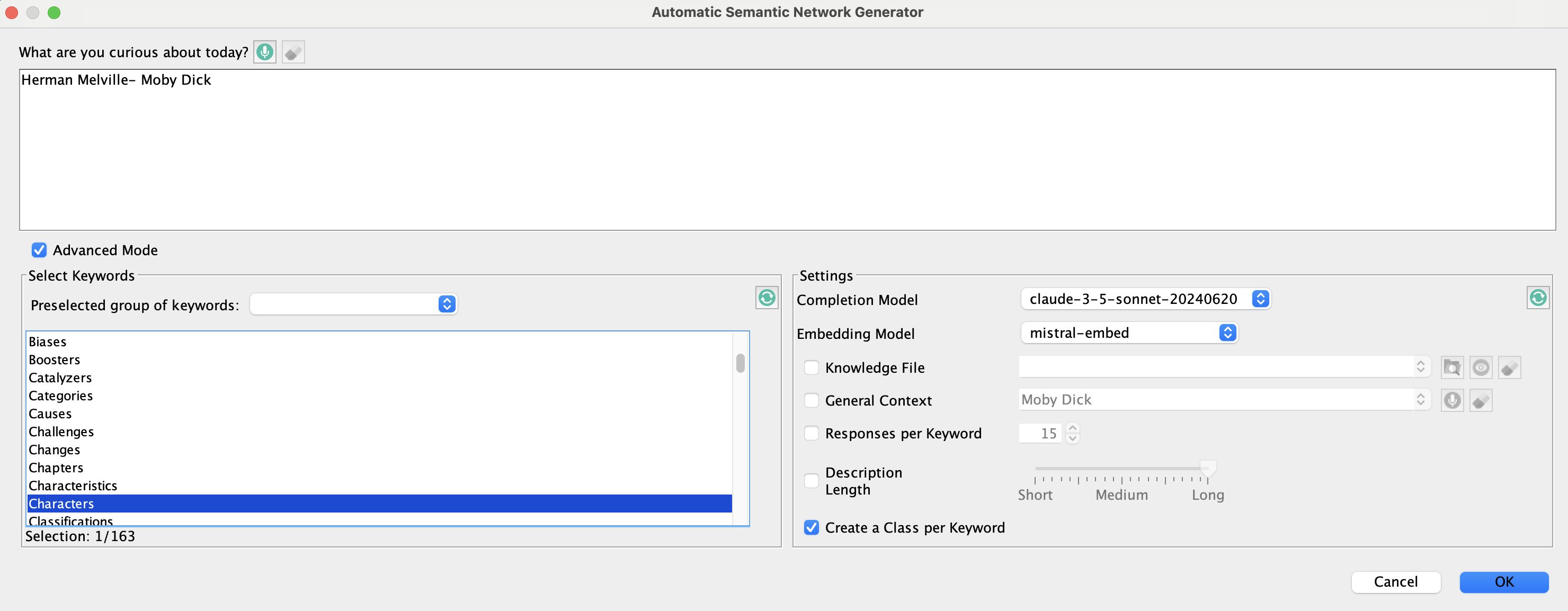 We begin our semantic network analysis by focusing on the main characters. For this, we utilize Hellixia’s Automatic Semantic Network Generator, specifically using its Advanced Mode to select Characters as the focal point from the 163 available keywords.