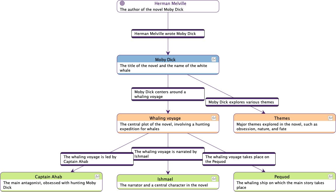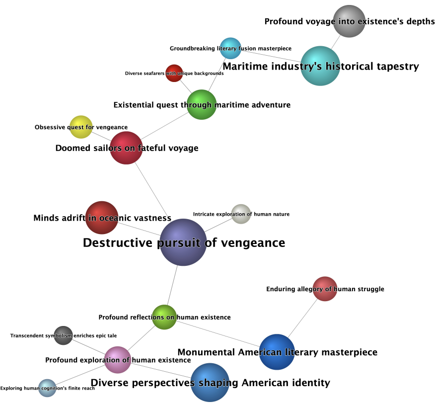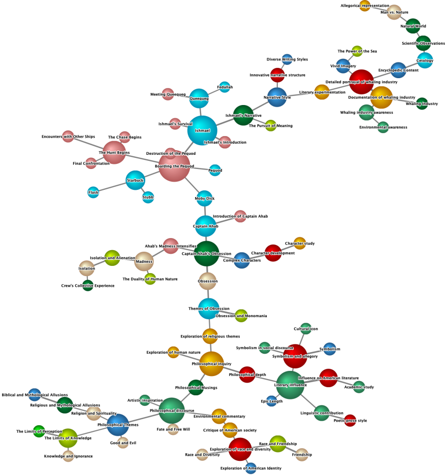 Now, suppose we want to assign a weight reflecting the importance of each character in the book. We can use the query “Herman Melville - Moby Dick (Add a weight in brackets from 0 to 100 to each node’s comments to reflect the importance of that dimension)” to achieve this.