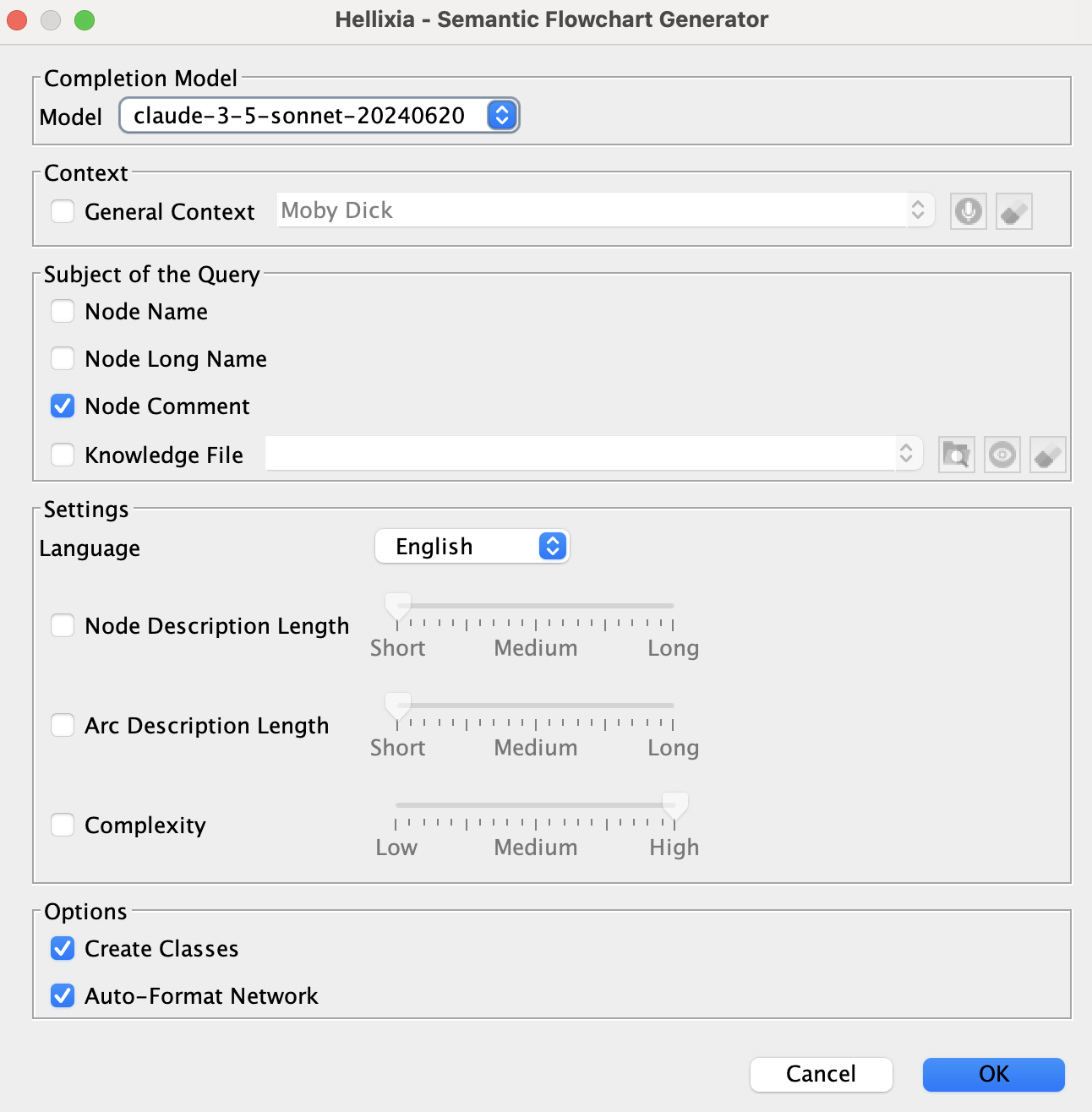 We begin by creating a node in a new graph and pasting the selected paragraph into the comment section of the node. Once the node is selected, we utilize Hellixia’s Semantic Flowchart Generator feature. The settings are configured using Claude 3.5 Sonnet, as demonstrated in the screenshot below: