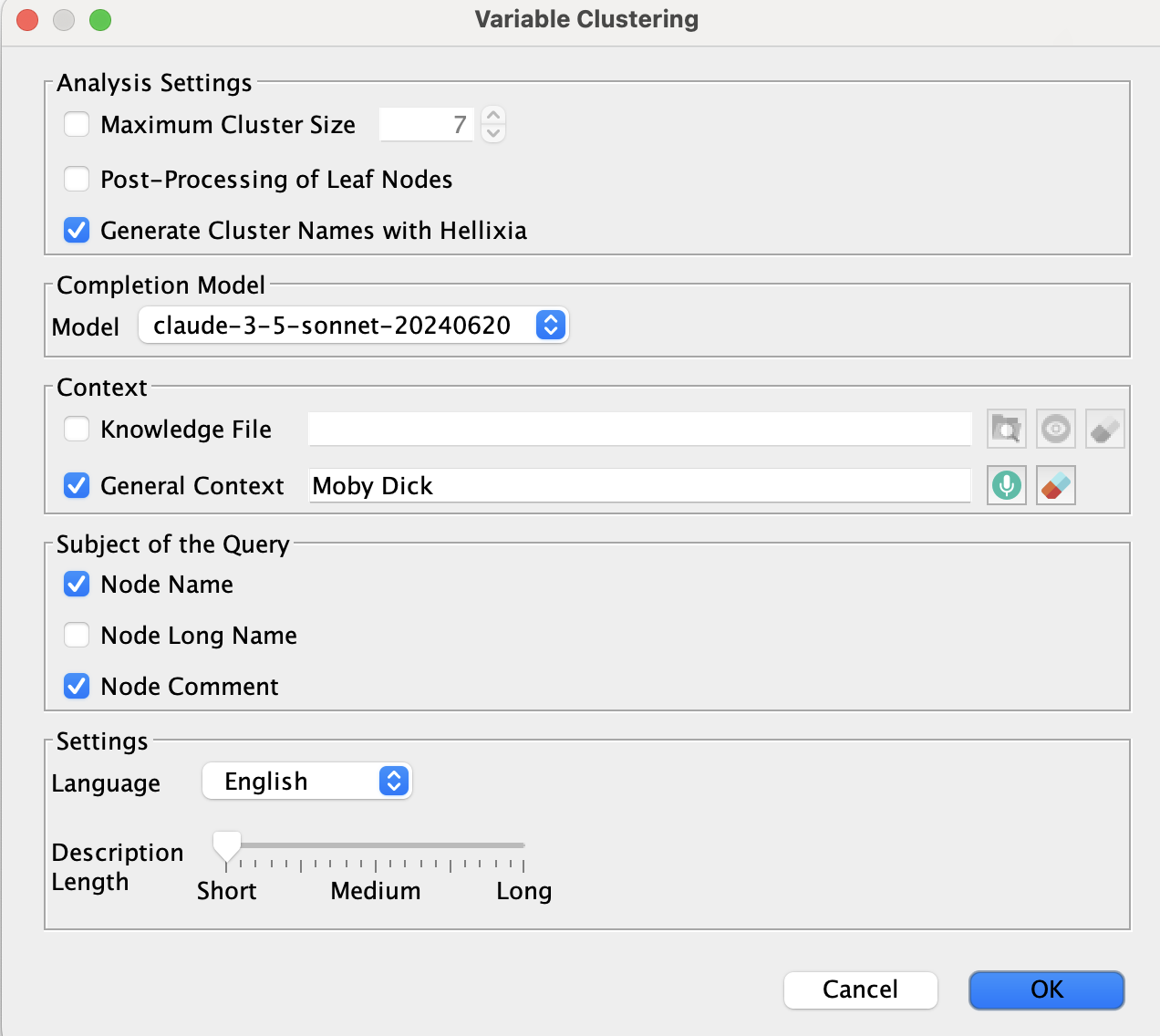 We now conclude this semantic network analysis part by using BayesiaLab’s Variable Clustering algorithm to create group of variables that are strongly correlated. We use the settings below, where we use Hellixia to automatically create a name for each cluster of variables, based on the variables belonging to the cluster.