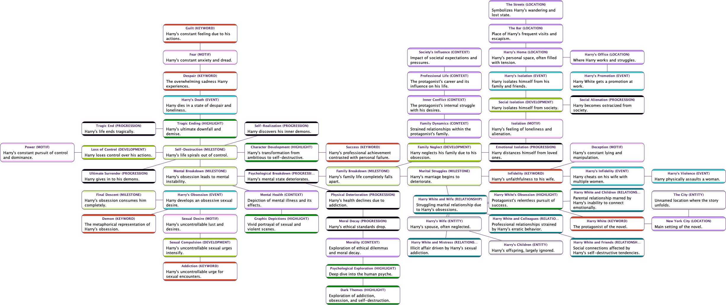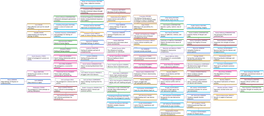 - Use the Dimension Elicitor, employing a broad array of keywords: Agents, Contexts, Developments, Entities, Events, Highlights, Keywords, Locations, Milestones, Motifs, Progressions, and Relationships. Set also the General Context to: “Hubert Selby Novel”