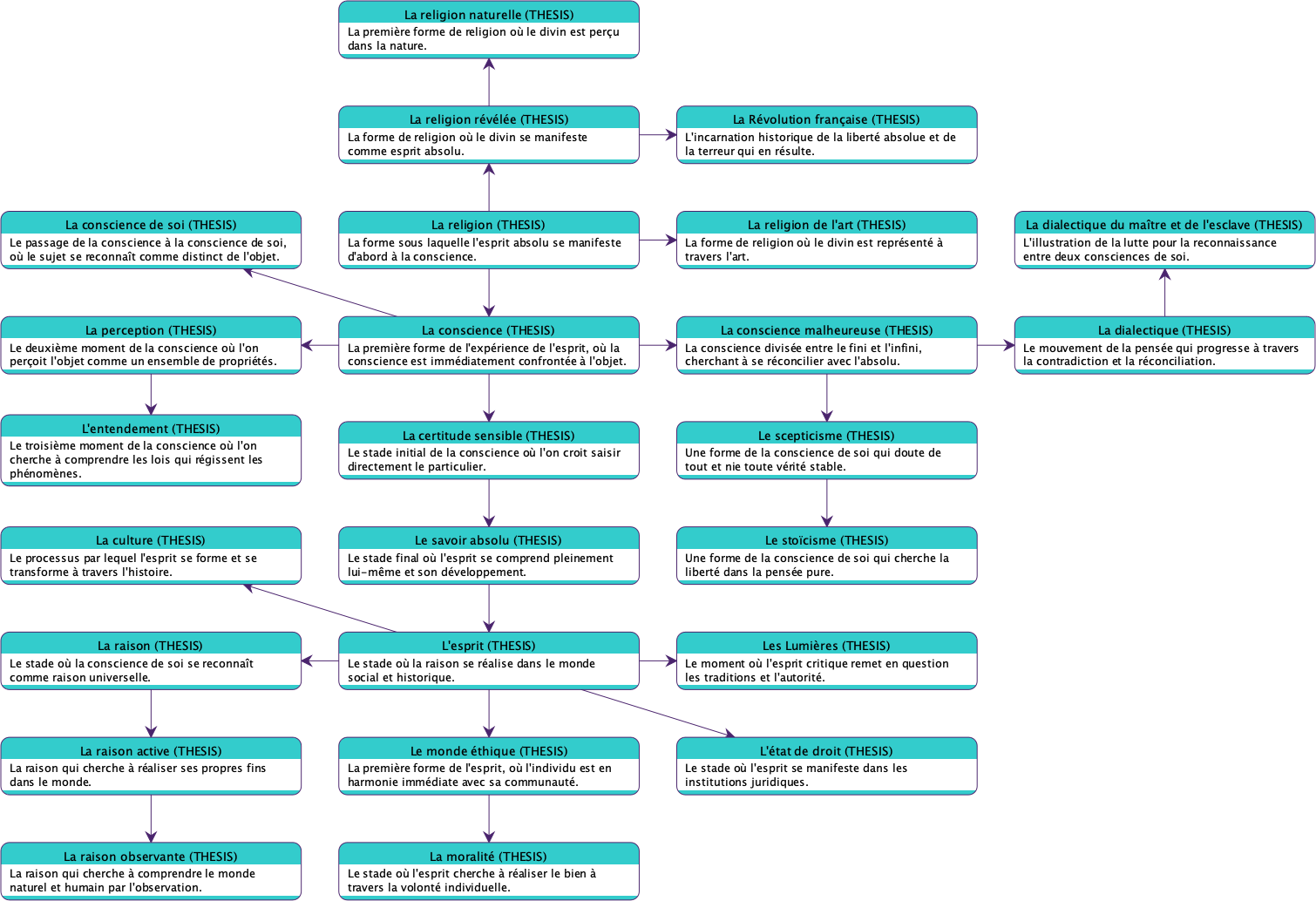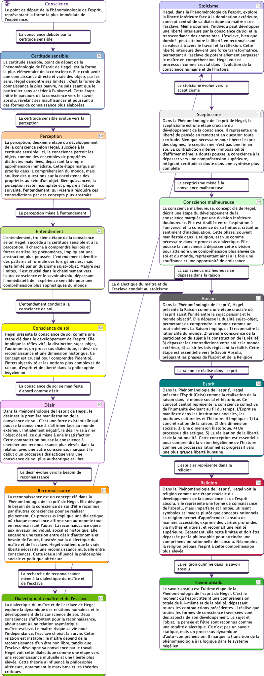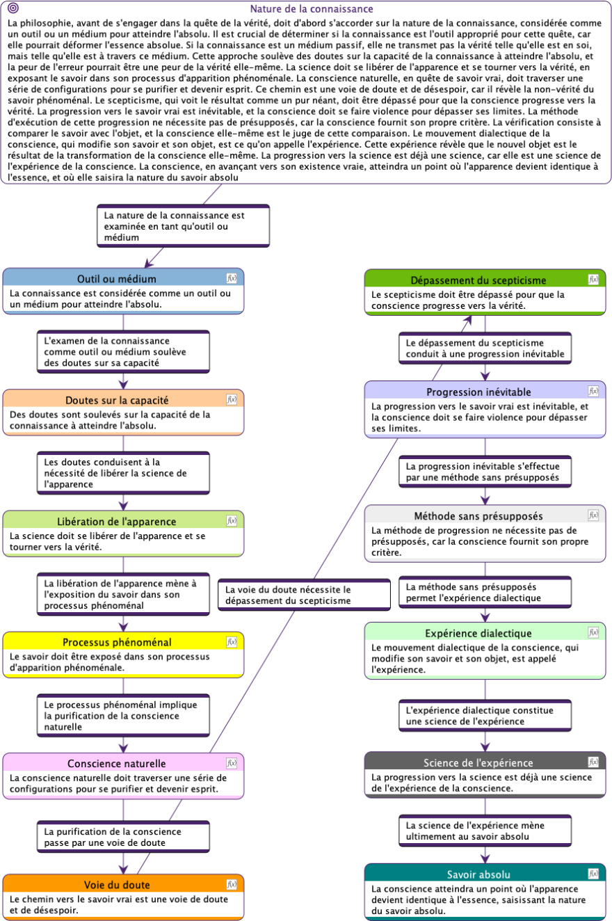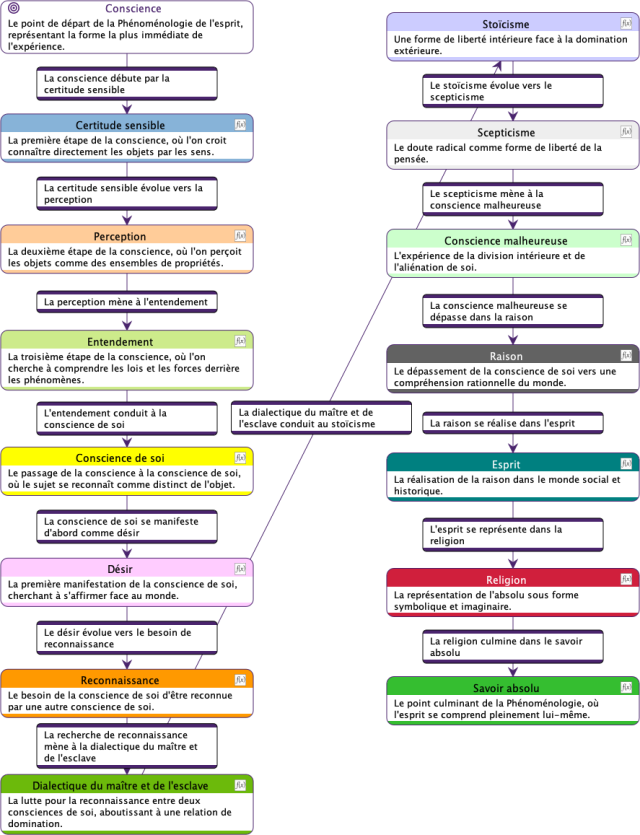 Ce diagramme décrit un processus de développement progressif de la conscience humaine. Chaque étape représente une forme plus sophistiquée de prise de conscience et de compréhension, avec l’aboutissement ultime du savoir absolu, une connaissance totale intégrée du monde et de soi-même. Ce modèle vise à expliciter comment les individus parviennent à une connaissance de plus en plus approfondie de la réalité et de leur propre nature. Hegel conçoit ce cheminement comme une ascension vers l’Esprit absolu, où la conscience atteint sa pleine réalisation.
