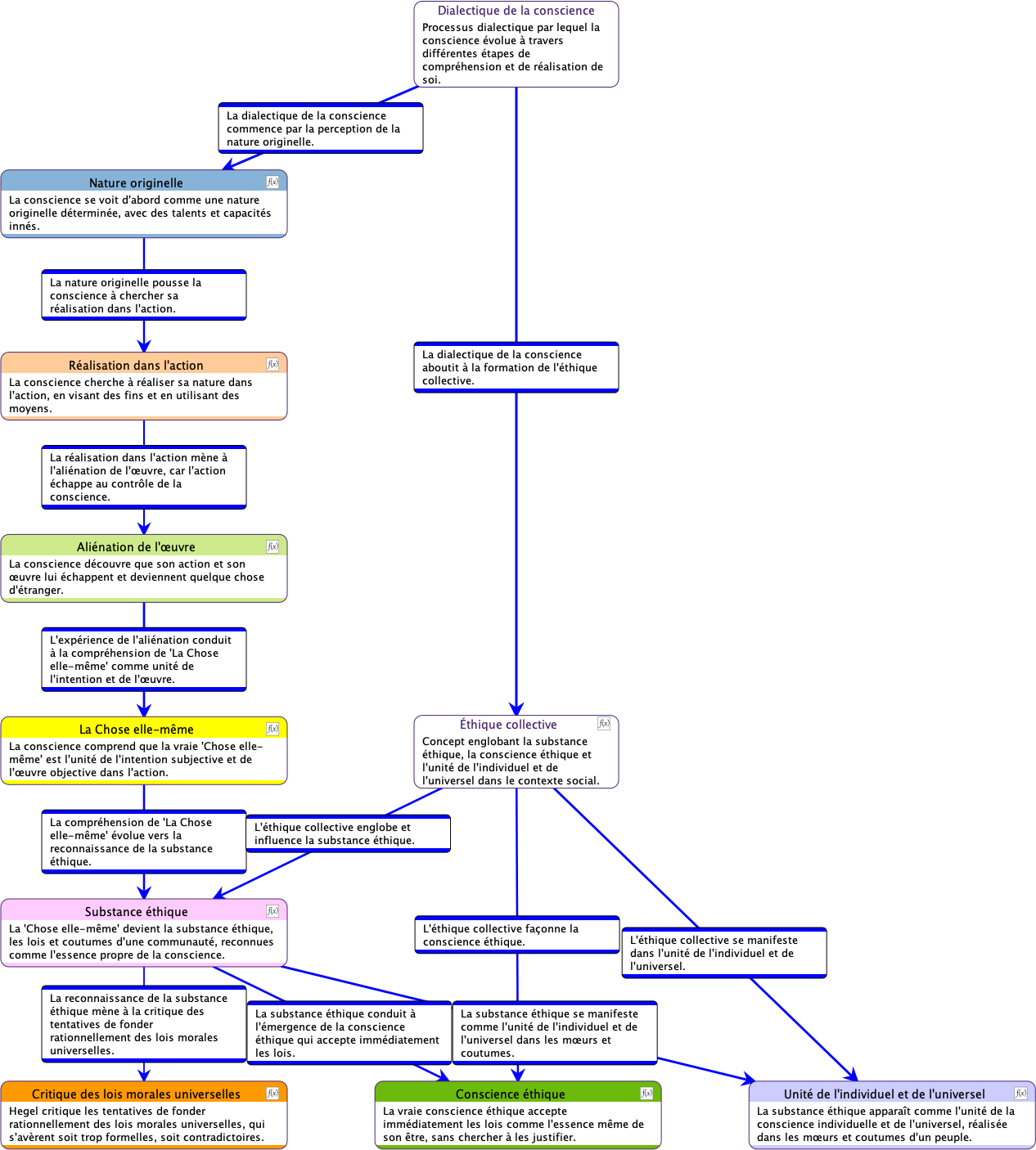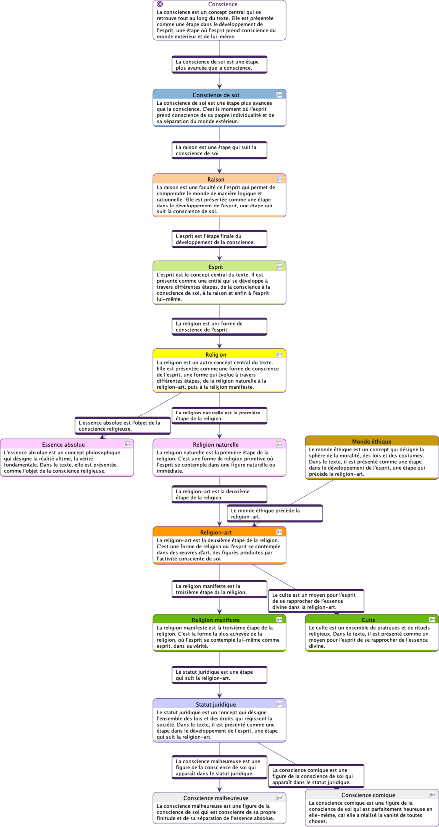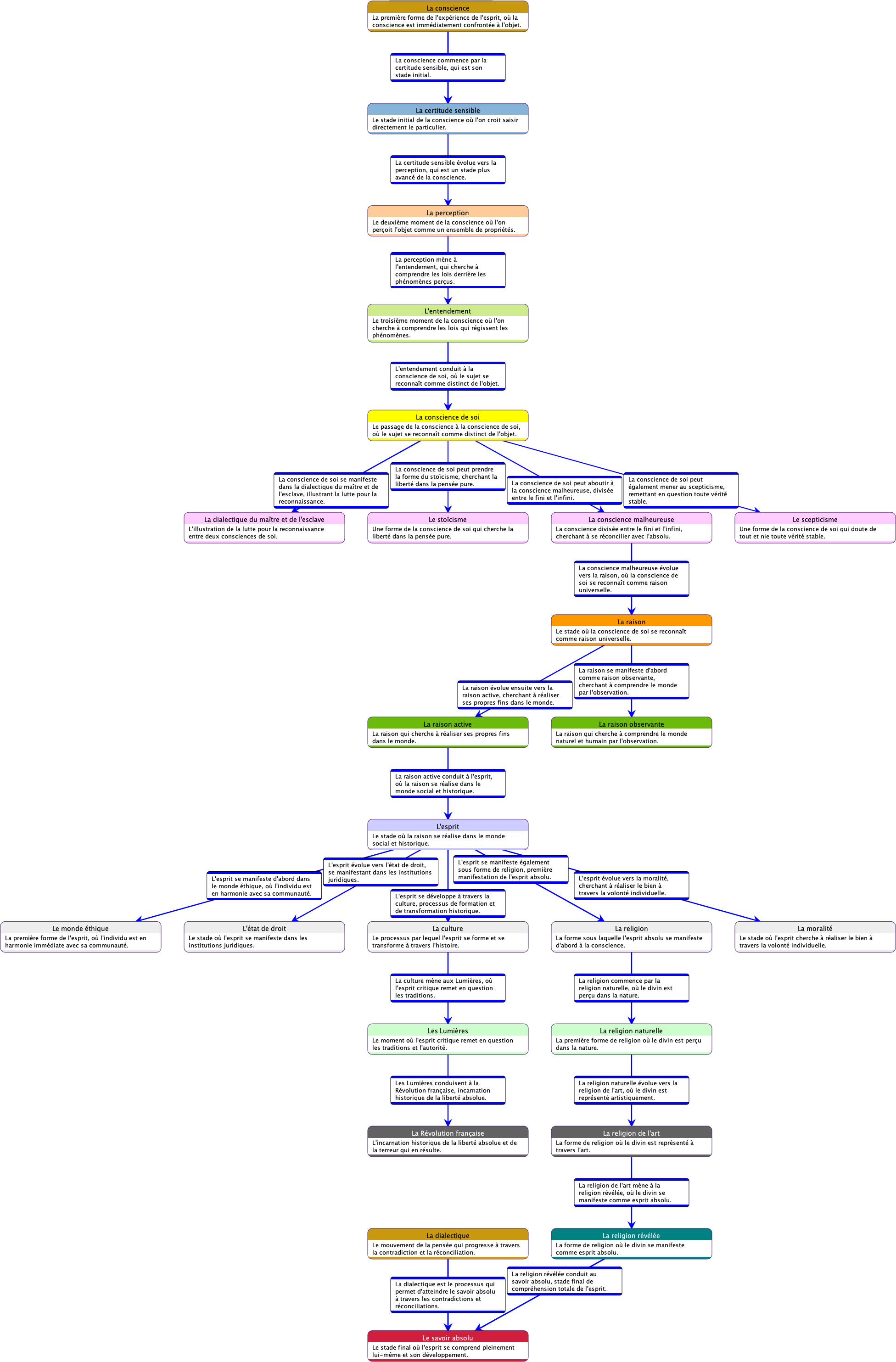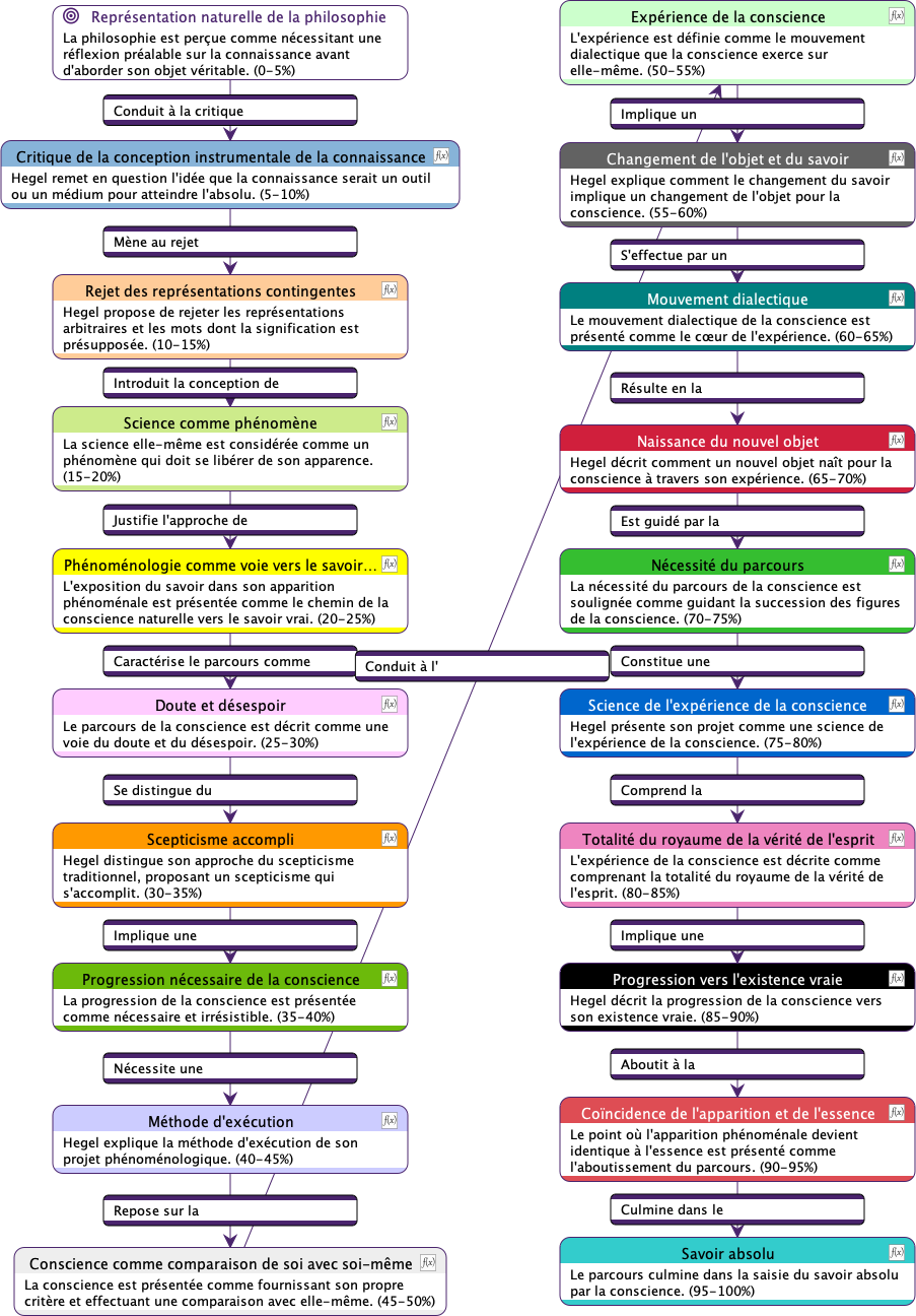 Ce diagramme décrit un processus de développement progressif de la conscience humaine. Chaque étape représente une forme plus sophistiquée de prise de conscience et de compréhension, avec l’aboutissement ultime du savoir absolu, une connaissance totale intégrée du monde et de soi-même. Ce modèle vise à expliciter comment les individus parviennent à une connaissance de plus en plus approfondie de la réalité et de leur propre nature. Hegel conçoit ce cheminement comme une ascension vers l’Esprit absolu, où la conscience atteint sa pleine réalisation.