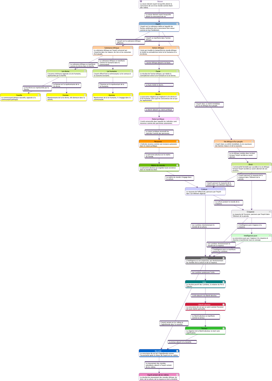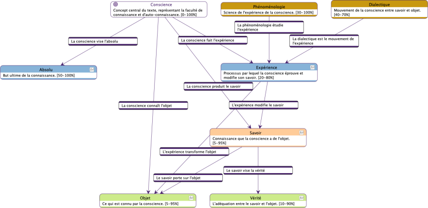 Cette fonctionnalité nous permet de naviguer de manière fluide entre différents niveaux de complexité. Nous pouvons ainsi adapter notre lecture aux besoins spécifiques de notre analyse, passant aisément d’une vue macroscopique des idées de Hegel à un examen microscopique de leurs nuances et implications.