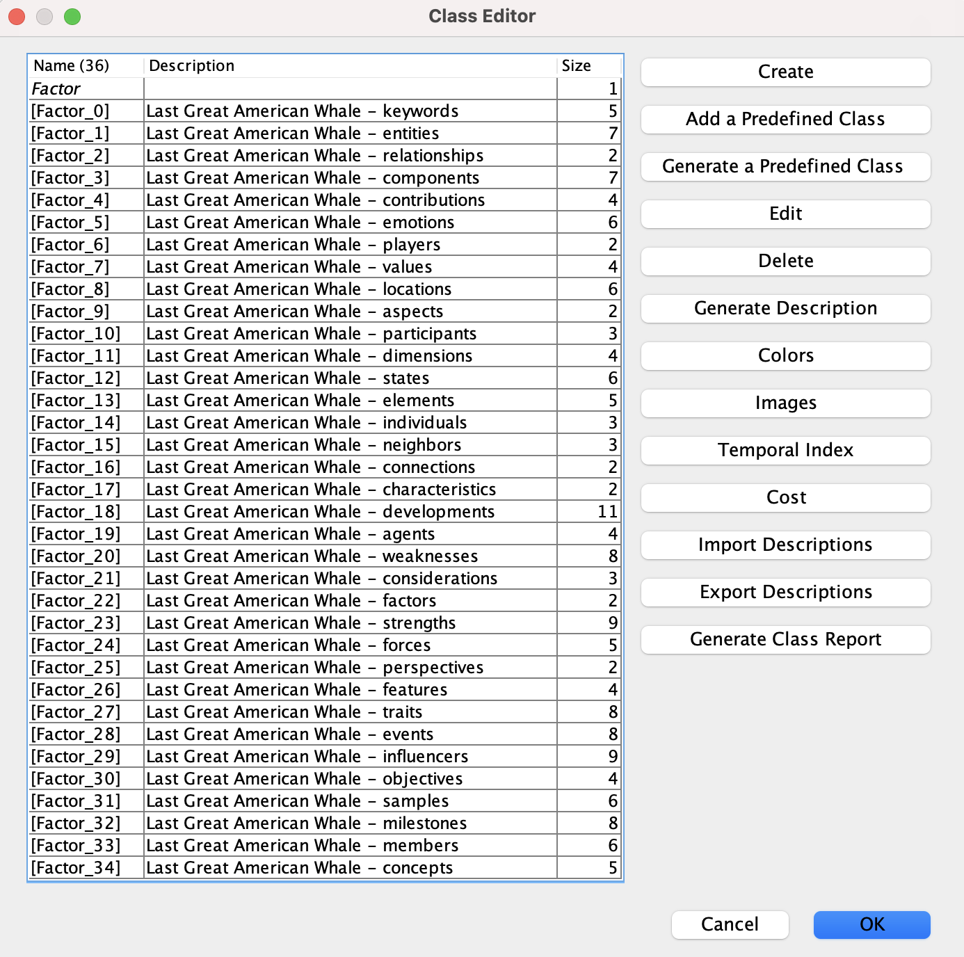 Open the Class Editor and run Class Description Generator to generate descriptive names for the factors in question. Use the Export Descriptions function, and save the newly created descriptions. - Return to Modeling Mode