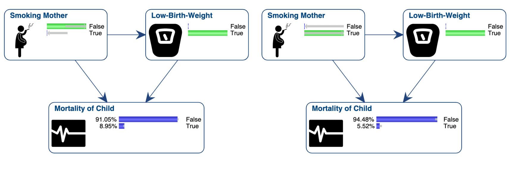 We implemented this counterintuitive example as a causal Bayesian network, which means the arcs represent causal relationships.