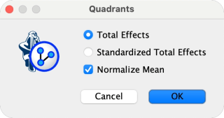 - The divider line on the y-axis is positioned at the mean value of the all the nodes’ calculated y metric, e.g., the mean of all Standardized Total Effects of the nodes on the Target Node, which is shown in this example.