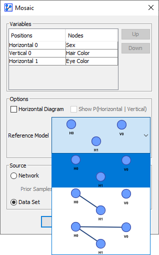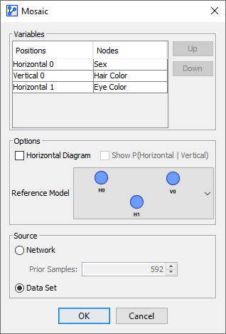 To explain the Mosaic Analysis workflow in more detail, we use a Bayesian network that represents the relationship between Hair Color, Eye Color, and Sex. You can download the network here:
