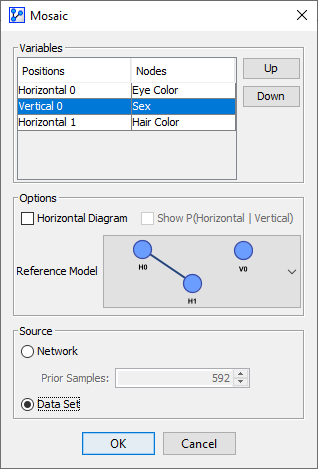 On this basis, we can revisit the Null-Hypothesis and now speculate that Eye Color is independent of Sex conditional on Hair Color. We arrange the variables accordingly in the Variables list.