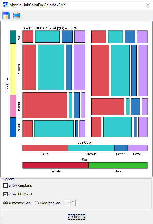 With the Resizable Chart option disabled, the Mosaic Plot will be of a fixed size. As a result, you may need to resize the window or use the scrollbars to see the entire plot.