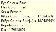 The Conditional Probability , i.e., the probability of Eye Color=Blue GIVEN THAT Hair Color=Red AND Sex=Female. Note that the vertical bar (”|”) means “given that.”
