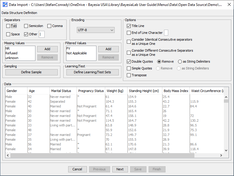 - In Step 1 — Data Structure Definition: Text File of the five-step Data Import Wizard, you need to define the dataset structure for BayesiaLab so that the data can be imported and interpreted correctly.
